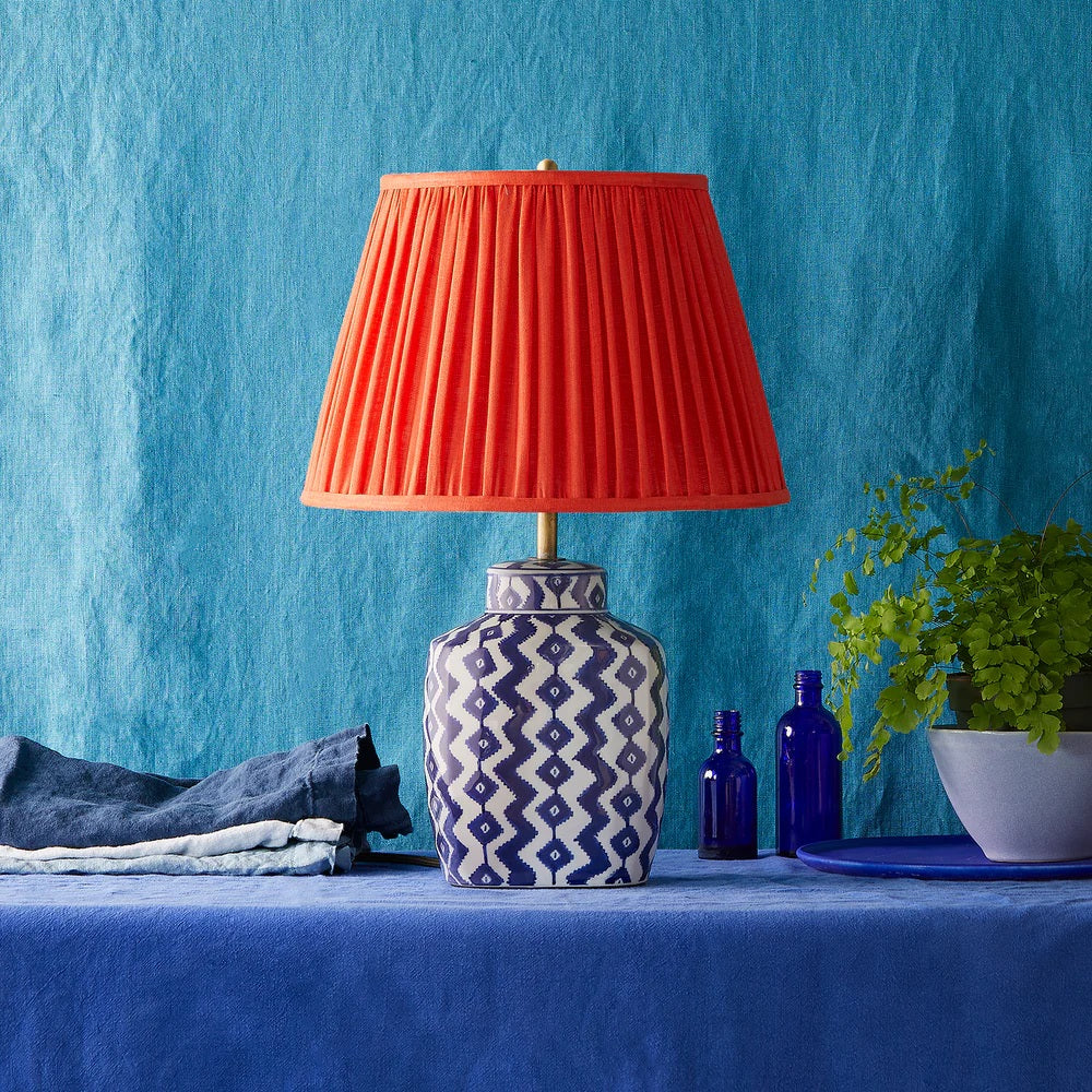 Think golds, moss greens, deep blues – or whatever colours say “autumn” to you. A silk shade in jade feels luxurious and warm; pleated cotton in earthy orange adds instant warmth; rattan brings in that rustic harvest feel.