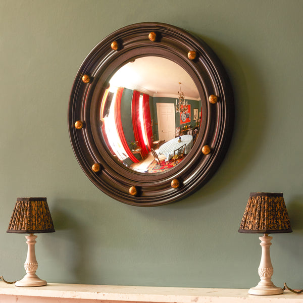 Our Lauren mirror is pretty punchy with its ten golden baubles around the frame. We love it! It's a bit different, a slightly modern take on a classic.
