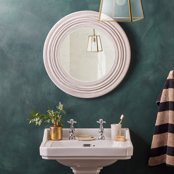 This startlingly lovely mirror is lifted by the paint effect. First the turned wooden framed is lacquered and then many of the edges are sanded off to just reveal the wood beneath. Finally a clear lacquer is applied to seal it. Lots of depth and interest...available in three colours.
